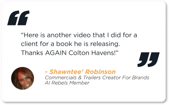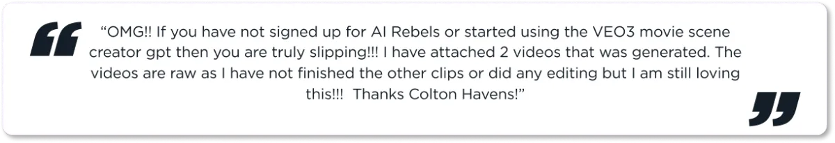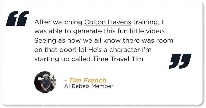 When you get AI Rebels Access, you'll be able to join the LIVE Bi-Weekly Coaching Calls with Colton Havens, and get your specific AI questions answered. You'll also get access to our complete AI Business & Life System covering everything from VEO3 videos to AI product creation, client acquisition with AI, and daily business automation, PLUS gain access to over $2,000 in Bonus Programs designed specifically for business owners, filmmakers and creatives.